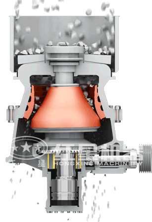 單缸圓錐破碎機(jī)工作時(shí):電機(jī)帶動(dòng)破碎機(jī)的小齒輪,小齒輪帶動(dòng)大齒輪,大齒輪組件(大齒輪、大齒輪架、偏心鋼套)帶動(dòng)偏心套組件(偏心缸套、偏心銅套)和主軸組件(主軸、內(nèi)錐、內(nèi)錐襯板)以理論垂直線為中心,在銅襯套內(nèi)公轉(zhuǎn),主軸組件在偏心銅套內(nèi)以主軸的中心線可以實(shí)現(xiàn)自轉(zhuǎn)。空機(jī)運(yùn)行的時(shí)候,偏心套組件“抱著”主軸組件和隨大齒輪一同公轉(zhuǎn),當(dāng)物料加入到破碎腔后,主軸總成(主軸、內(nèi)錐)在物料的阻力下在偏心銅套內(nèi)緩慢的自轉(zhuǎn)。內(nèi)錐的運(yùn)行軌跡看起來是在破碎腔內(nèi)來回?cái)[動(dòng),同時(shí)緩慢的旋轉(zhuǎn)。物料被擺動(dòng)的內(nèi)錐擠壓破碎。支撐套與架體連接處靠液壓缸壓緊,當(dāng)破碎機(jī)內(nèi)落入金屬塊等不可破碎物體時(shí),單缸的動(dòng)錐由底部液壓活塞托起,起到排放口調(diào)整和過鐵保護(hù)、反復(fù)起落排除堵礦的作用。